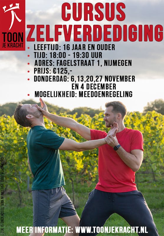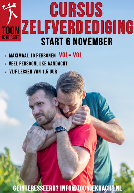 Toon Je Kracht start op donderdag 6 november 2025 een cursus zelfverdediging voor een kleine groep van maximaal 10 personen. In de cursus zelfverdediging gaan we ons voornamelijk richten op twee dingen; u zelf verdedigen vanaf de grond en het voorkomen van/ los komen wanneer u van voren of van achteren wordt gegrepen. Naast deze twee focus punten zullen we ons ook gaan richten op verschillende manieren van stoten en trappen.