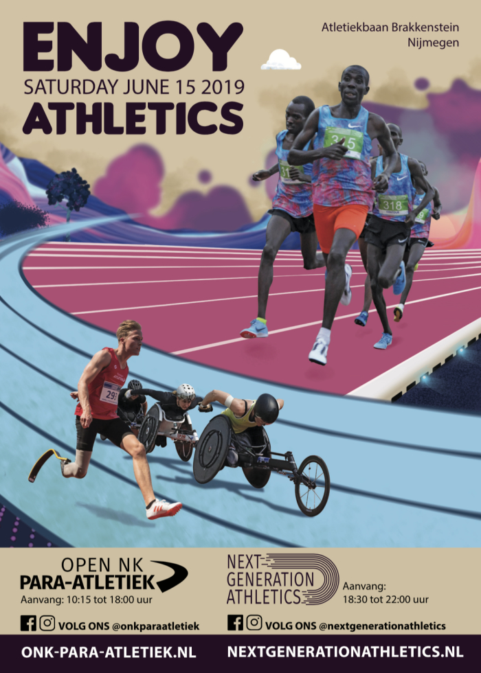 Op zaterdag 15 juni komen nationale en internationale topatleten en para-atleten naar de atletiekbaan in Brakkenstein voor het Open Nederlands Kampioenschap Para-atletiek en Next Generation Athletics. Tijdens het avondprogramma bij Next Generation Athletics strijden topatleten van over de hele wereld om het behalen van een limiet voor het WK Atletiek dat dit najaar in Doha plaatsvindt. Atleten die we o.a. kunnen verwachten zijn Susan Krumins, Sanne Wolters-Verstegen, Marlou van Rhijn en Mike Foppen.