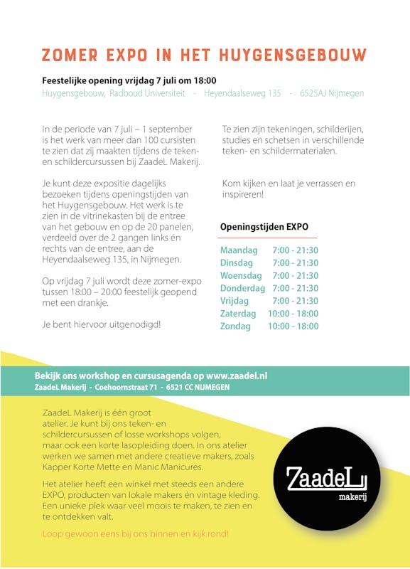 In de periode van 7 juli - 1 september is het werk van meer dan 100 cursisten te zien dat zij maakten tijdens diverse teken- en schildercursussen bij ZaadeL Makerij, in Nijmegen. Te zien zijn tekeningen, schilderijen, studies en schetsen in verschillende teken- en schildermaterialen.