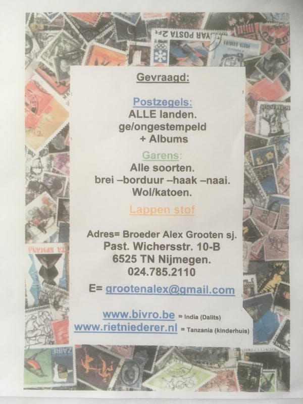 Hij vraagt Postzegels, garens en lappen stof, zie bijgeleverde affiche: