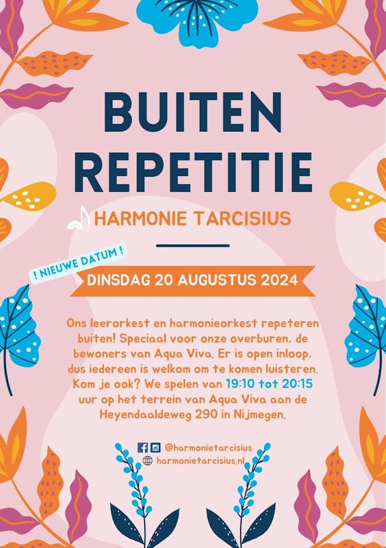 Vanavond is de buitenrepetitie van Harmonie Tarcisius. Gezien de weersvoorspellingen gaan we die repetitie binnen doen, in de zaal van Roomsch Leven. Je bent van harte welkom!