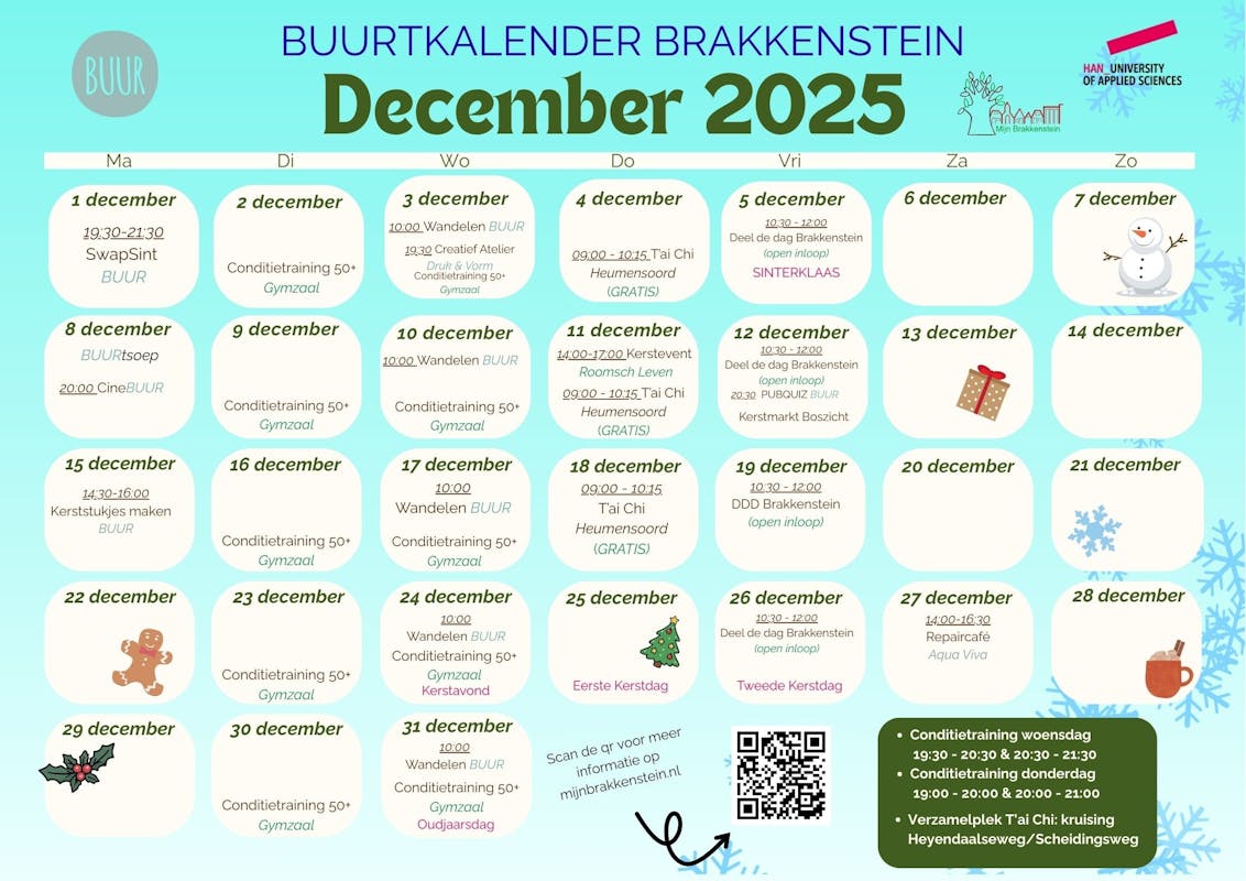 De nieuwe Buurtkalender voor december, met weer allemaal leuke (kerstige) activiteiten in Brakkenstein.