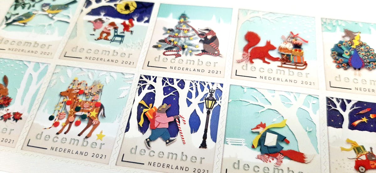 Vanaf vandaag zijn de Decemberzegels te koop, èn ze mogen meteen geplakt worden. Dit jaar zijn de zegels ontworpen door Geertje Aalders. Op een velletje zitten 20 stuks, en de kosten hiervoor zijn € 18,20.