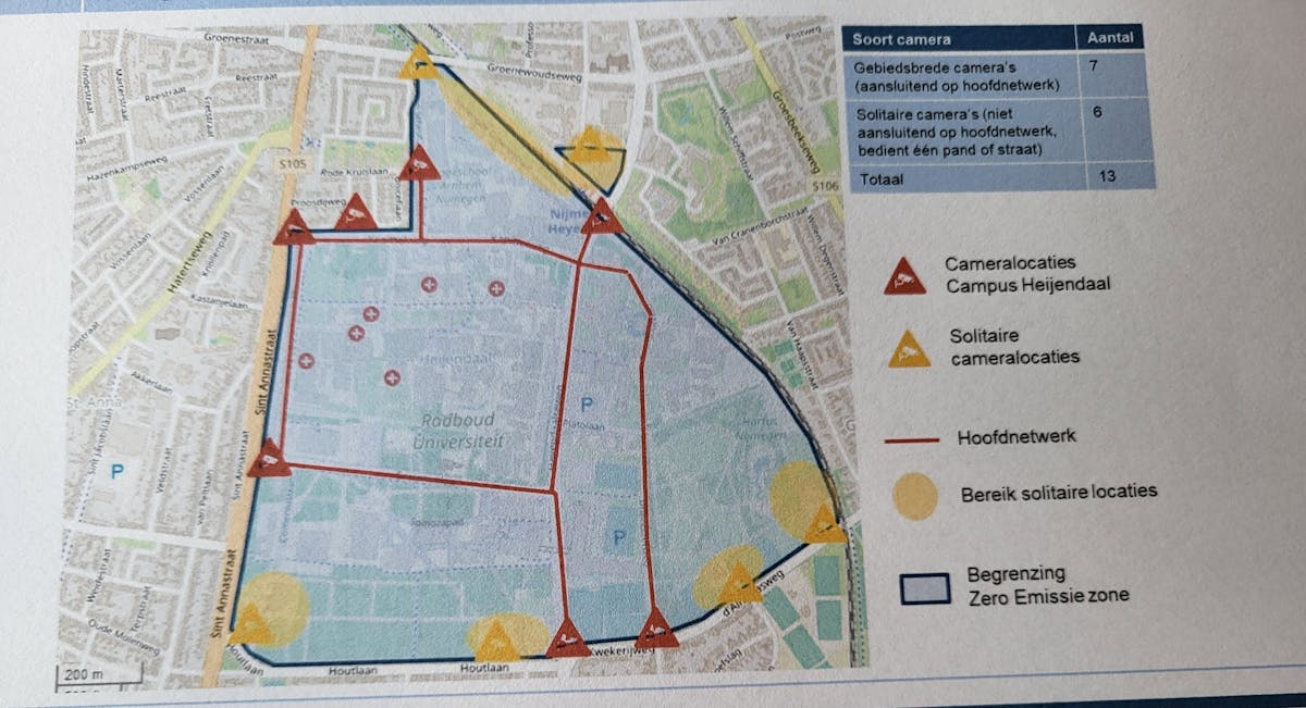 Op het kaartje uit het Rapport Haalbaarheid zero emissie zone Stadslogistiek Campus Heijendaal ( juli 2021) zijn de aanbevolen locaties voor de camera's te zien. Uit het verkeersbesluit zelf is overigens niet op te maken waar de camera locaties gepland zijn.