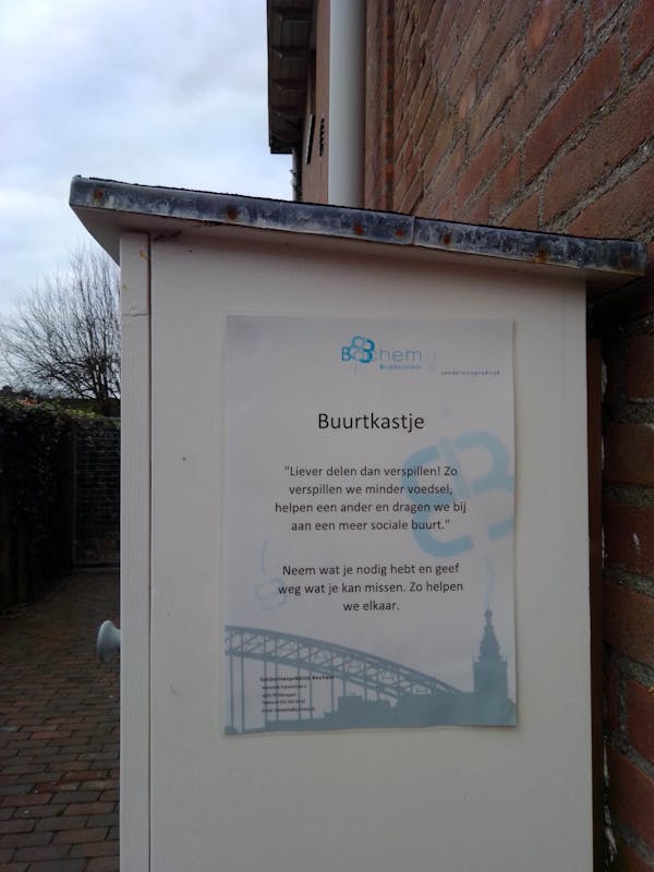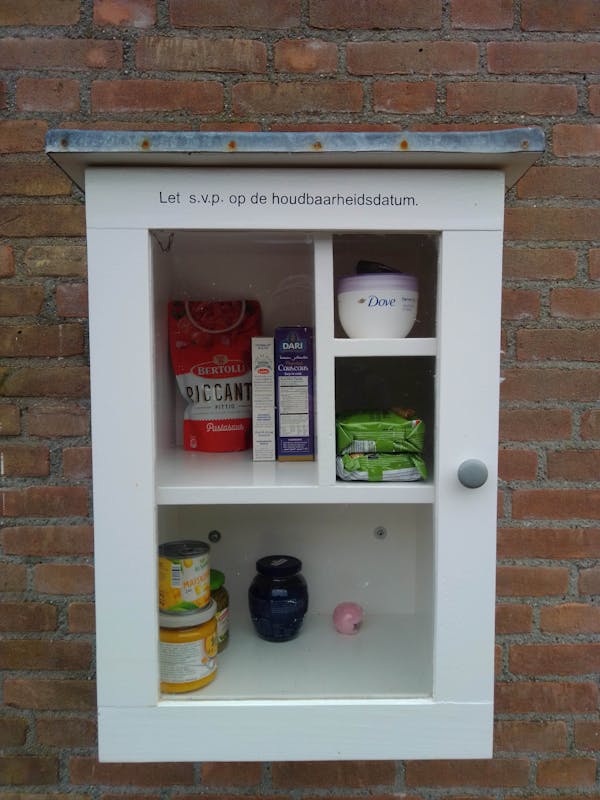 Er hangt zelfs een weggeefkastje, met houdbare spullen en spulletjes voor persoonlijke verzorging voor mensen die dat kunnen gebruiken. Je kunt er ook spullen in achterlaten, bijvoorbeeld wanneer je in een aanbieding meerdere stuks koopt, waarvan je er een of twee afstaat. Houd het wel schoon.