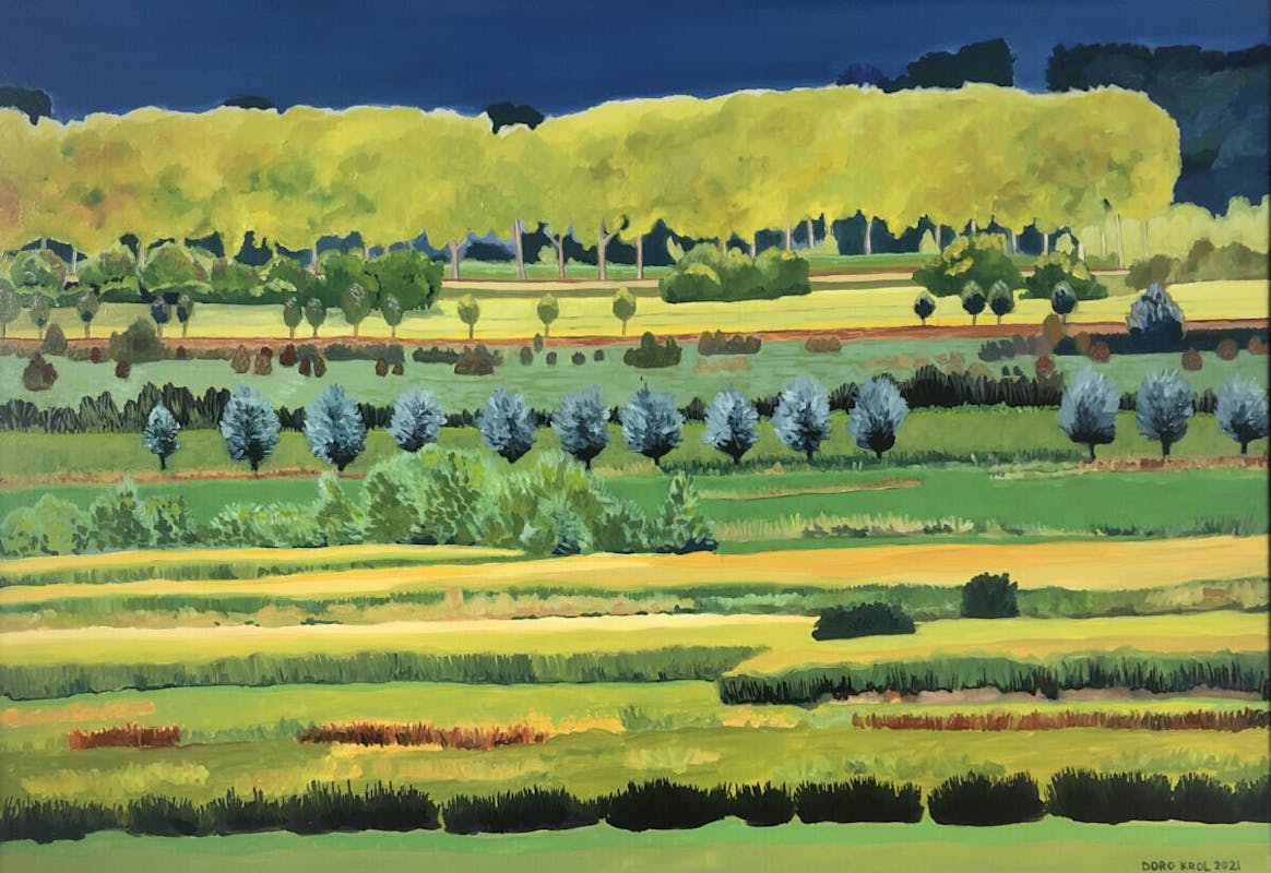 Foto: Schilderij van kunstenares Doro Krol uit Nijmegen. Zij schildert veelvuldig landschappen in de Ooijpolder.