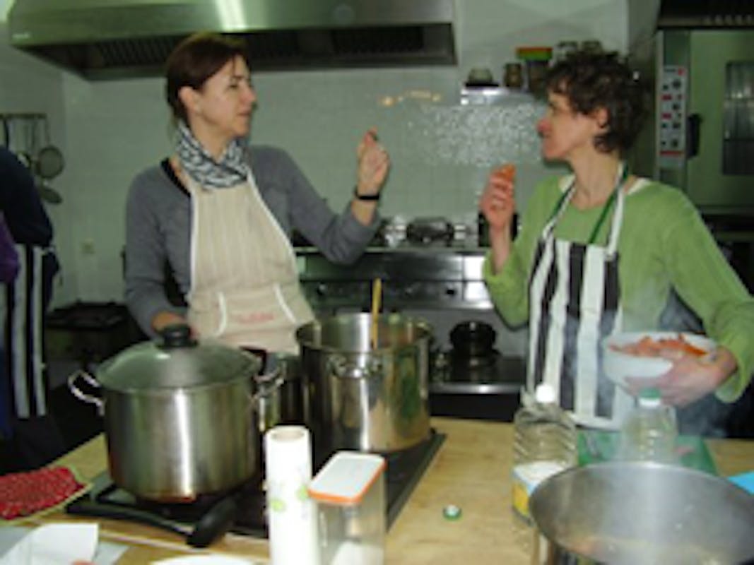 De groep bestaat uit zes vrouwen die een keur aan recepten hebben verzameld vanuit hun landen en contacten. We starten de avond met een kopje koffie/thee en wat lekkers. De recepten van het voor-, hoofd-, bij- en nagerecht worden uitgedeeld en besproken. Samen met de cursisten wordt de maaltijd klaargemaakt en genuttigd. Tussendoor wordt er gesproken over kruiden en andere voedingsmiddelen, over land en achtergrond van ieder en wat allen zoal meemaken. En tot slot is er natuurlijk de gezamenlijke afwas. Het zijn vaak zinvolle ontmoetingsavonden, in het teken van een inspirerende, interculturele samenwerking. Smakelijk eten, استمتع بالكرنب, Afiyet olsun, Cunto Wanaagsan, приятного аппетита.