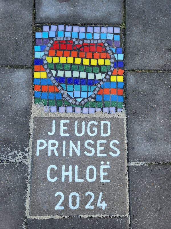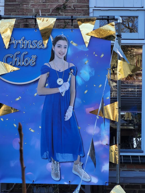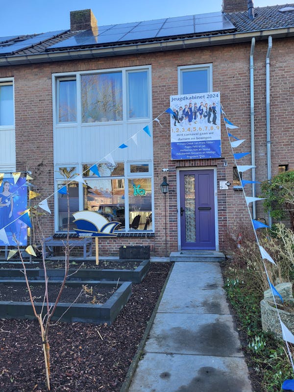 Ook het huis van Jeugdprinses Chloe is prachtig versierd ! Niet alleen met de banner van het Jeugdkabinet 2024, maar ook met de bekende herdenkingsstoeptegel en met een bijna levensgroot portret !