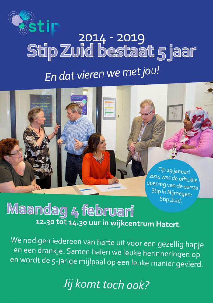 We nodigen iedereen van harte uit voor een gezellig hapje en een drankje. Samen halen we leuke herinneringen op en wordt de 5-jarige mijlpaal op een leuke manier gevierd.. En wel op maandag 4 februari a.s. van 12:30 tot 14:30 in het Wijkcentrum Hatert (Couwenbergstraat 22, Nijmegen)