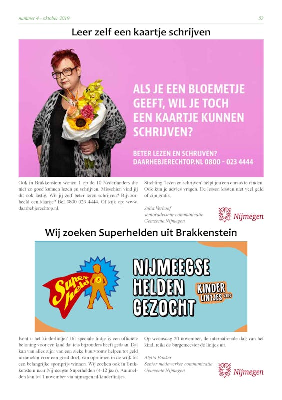 Namens de gemeente twee oproepen ook gepubliceerd op blz 53 in het wijkblad Brakkenstein van oktober 2019.