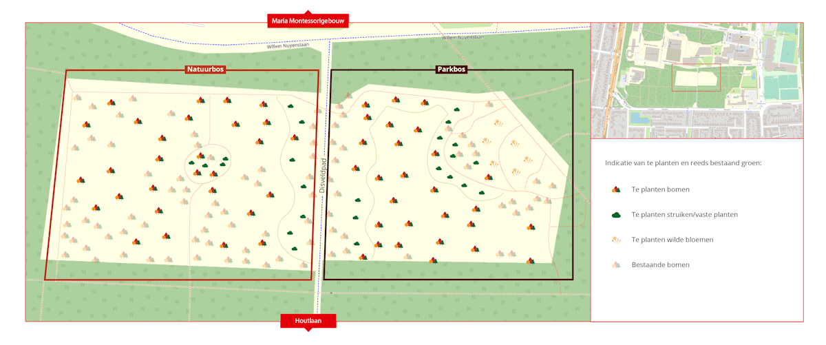De werkgroep heeft een ontwerp gemaakt dat uitgaat van twee bostypen. Een parkbos ten oosten van het Disveldpad en een natuurbos dat aansluit aan het bestaande bos ten westen van het pad.
