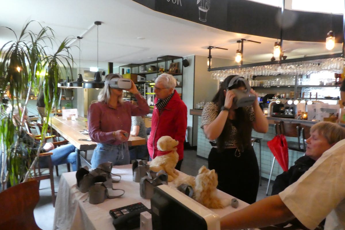 De studenten hadden ook VR (Virtual Reality) brillen geregeld. Dit zijn een soort enorme brillen die je over je hoofd doet en dan zie je allerlei interessante plaatsen, ik kwam terecht in Australië en in het Achterhuis van Anne Frank. Een gave ervaring.