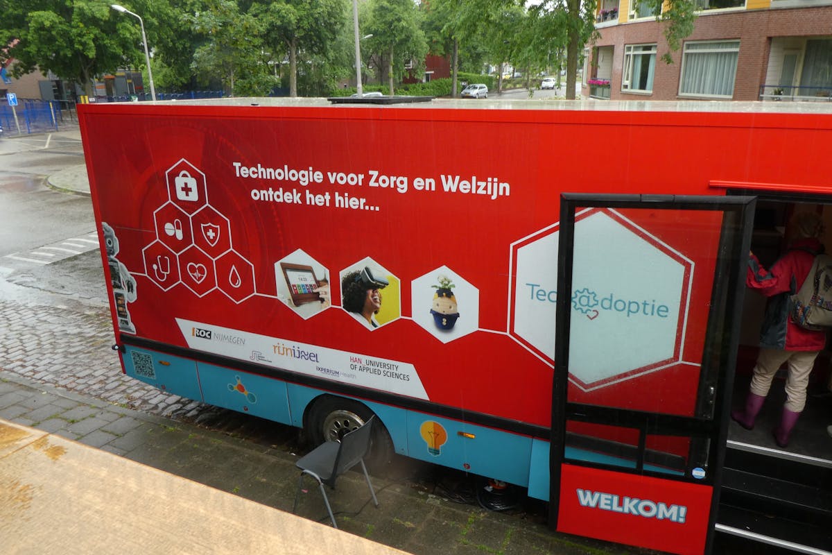 Vijf studenten van de HAN organiseerden op 8 juni een interessant technologie event. Op hun flyer stond “Bent u benieuwd over (zorg) technologie of wilt u iets nieuws ontdekken, kom dan naar ons evenement!” En “Tijdens het evenement komt er een technologie bus met verschillende snufjes” En “Enkele voorbeelden: de tessa, vr-brillen en een robotmaatje” en “Komt u ook? Aanmelden is niet nodig”