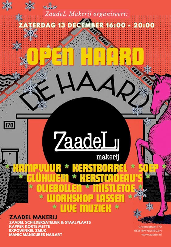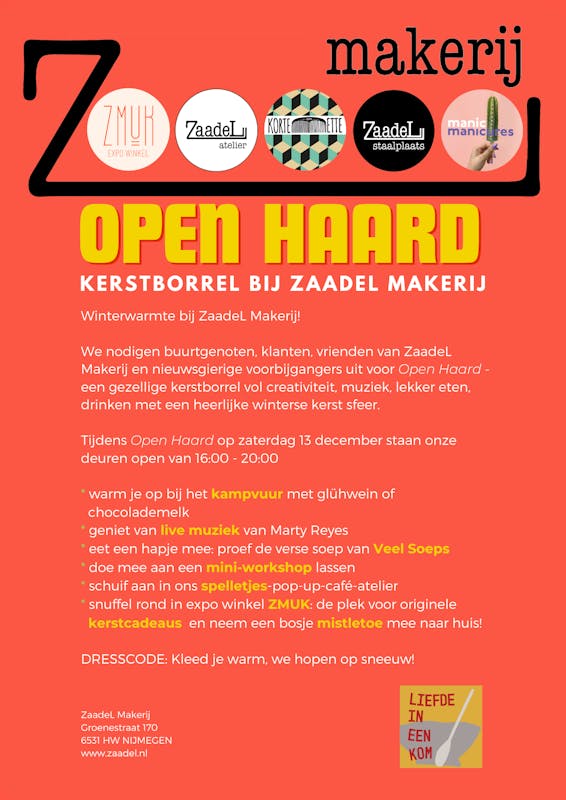 Save the date! Zaterdag 13 december OPEN HAARD kerstborrel bij ZaadeL Makerij, de creatieve broedplaats in Nijmegen aan de Groenestraat 170. We nodigen buurtgenoten, klanten, vrienden van ZaadeL Makerij en nieuwsgierige voorbijgangers uit voor Open Haard - een gezellige kerstborrel met soep en oliebollen, vol creativiteit en livemuziek bij het kampvuur. Dit alles in een heerlijke winterse kerstsfeer!