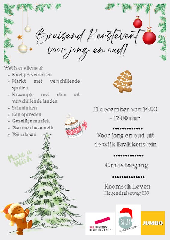 Op donderdag 11 december organiseren studenten Pazjien, Emma, Nisa, Pernille en Ela van de HAN samen met Buur een sfeervol Kerst Event voor jong en oud in Roomsch Leven. Tijdens deze feestelijke middag willen we graag buurtbewoners, vrienden en kennissen samenbrengen om te genieten van gezelligheid, muziek, lekkernijen, creatieve activiteiten en mooie kerstkraampjes. Kom je ook kerstkoekjes versieren? Warme chocolademelk met slagroom drinken? Luisteren naar een leuk optreden?