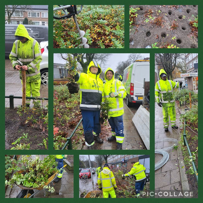 In de stromende regen waren de DAR medewerkers van Beplantingen vanochtend in de weer om de groenstroken voor de ALDI weer toonbaar te maken.