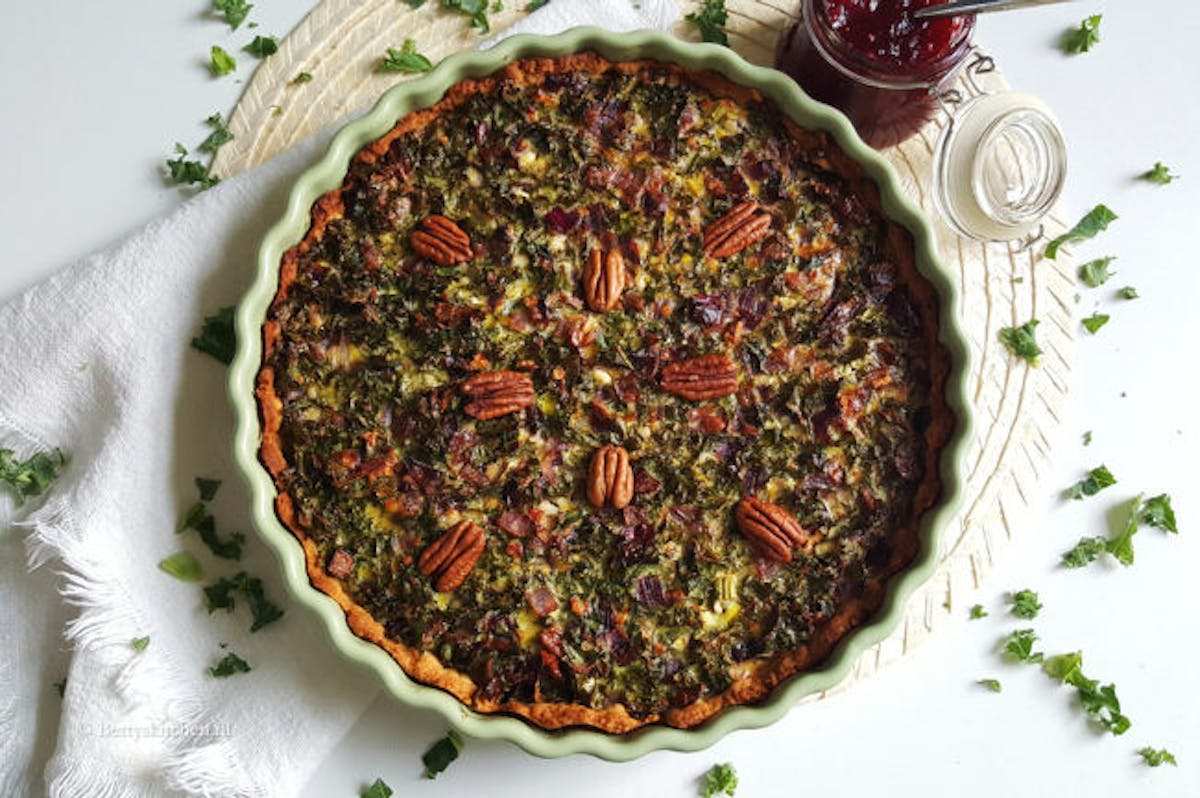 - Zodra de boerenkool quiche gaar is haal je hem uit de oven en laat hem iets afkoelen voordat je hem aansnijdt. Druk de achtergehouden pecannoten in de bovenkant voordat je hem serveert.