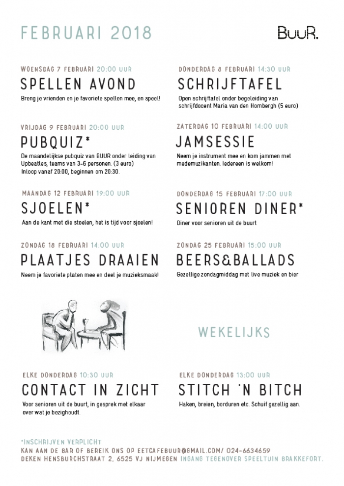 Benieuwd wat er allemaal in februari te doen is bij BUUR? De evenementenkalender geeft je een mooi voorproefje. En hé, als jij iets leuks weet of wilt organiseren komende maanden: laat van je horen! Je kunt ons altijd mailen op .
