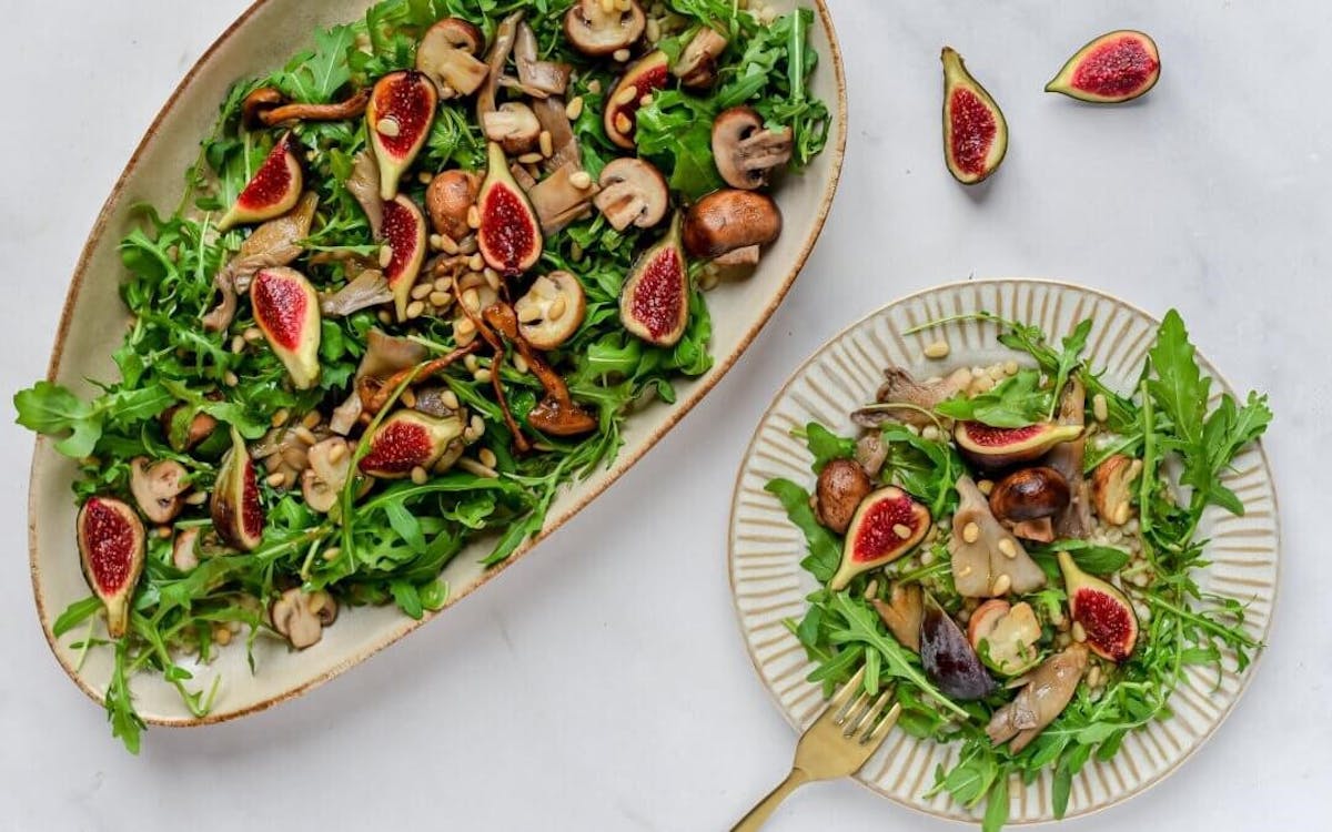 5. Verdeel de rucola en de parelcouscous over een grote serveerschaal. Besprenkel het geheel met de dressing en verdeel de paddenstoelen en vijgen over de salade. Voeg als laatste de geroosterde pijnboompitten toe en je bent klaar om het te serveren!