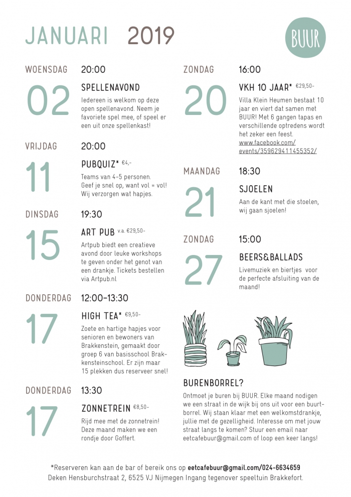 Een nieuw jaar betekent ook een nieuwe maand met leuke activiteiten bij BUUR! Begin het jaar goed met een spellenavond, pubquiz of high tea. Extra bijzonder: in januari houdt BUUR samen met Villa Klein Heumen een zesgangen tapasdiner met optredens. Ook sluiten we de maand zoals gewoonlijk weer af met Beers & Ballads. Zien we je daar?