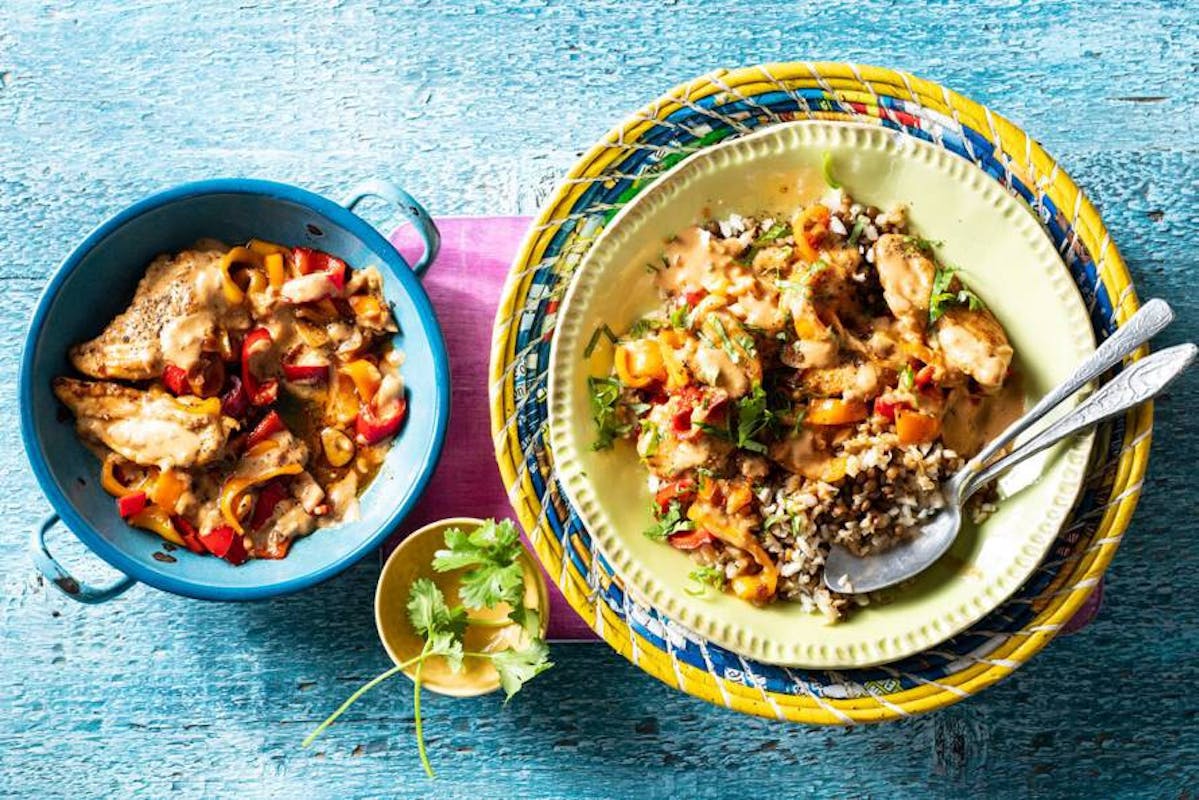 - Doe de pindakaas, sambal en het water in een steelpan, breng aan de kook en laat 1-2 min. op laag vuur koken tot een gladde saus. Roer door de kip en paprika. Snijd de koriander fijn. Verdeel de bloemkool-linzenrijst over diepe borden. Verdeel de kip met saus erover. Bestrooi met de koriander.