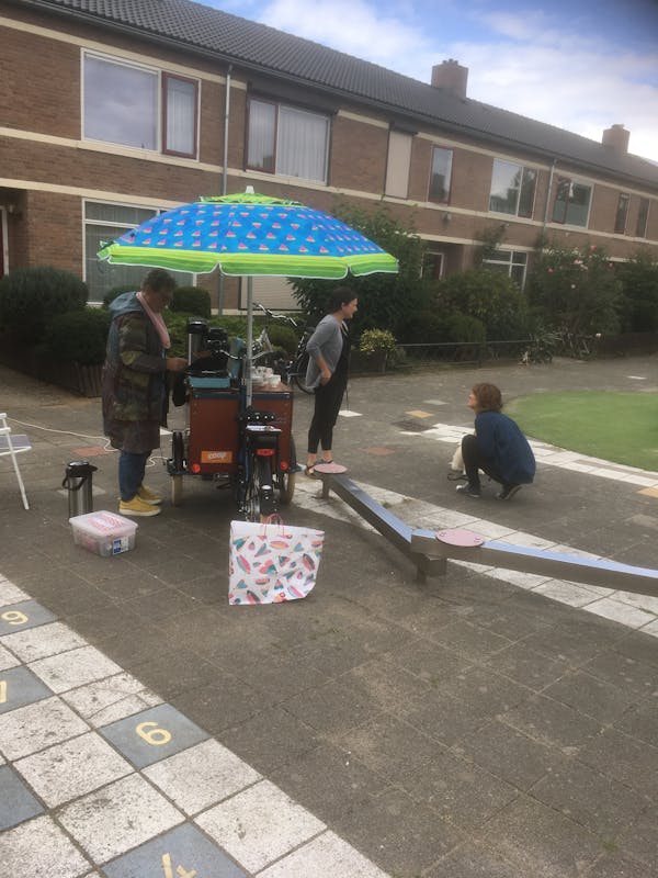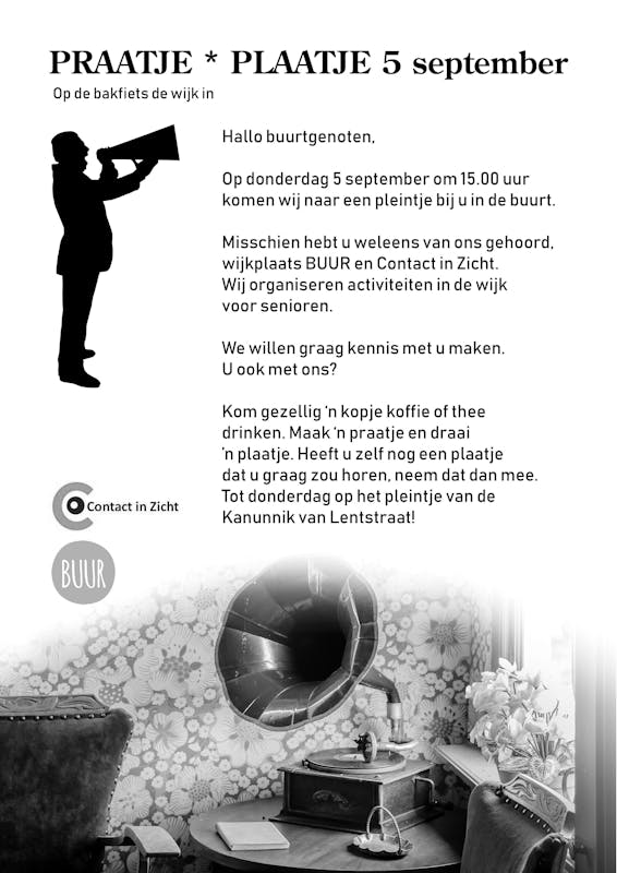 Donderdag 5 september bezoek ik het pleintje van de Kanunnik van Lentstraat. Om drie uur zie ik Sylvia Thijssen van Buur en Tineke Elbers van Contact in Zicht met een handige Fietskar en twee parasols. Op de kar zie ik een Pick-up. Tineke zet “Singing in the rain” op. Maar gelukkig blijft de regen weg. De dames willen met een praatje en een plaatje de bewoners van de pleintjes verrassen en uitnodigen om leuke dingen te gaan doen en beleven in Buur en met elkaar aan de praat te komen. Een moeder en een dochtertje lopen bij het speeltoestel met mooie kat Billy, verder komt in eerste instantie niemand opdagen. Toch hebben alle mensen in de buurt een uitnodiging in de bus ontvangen. Ik krijg koffie en lekkere koek van BUUR en maak foto's en stel vragen. Ik krijg ook promotiemateriaal, waaronder een papieren frietzak met papieren frieten in de vorm van vragen die de bewoners kunnen invullen.