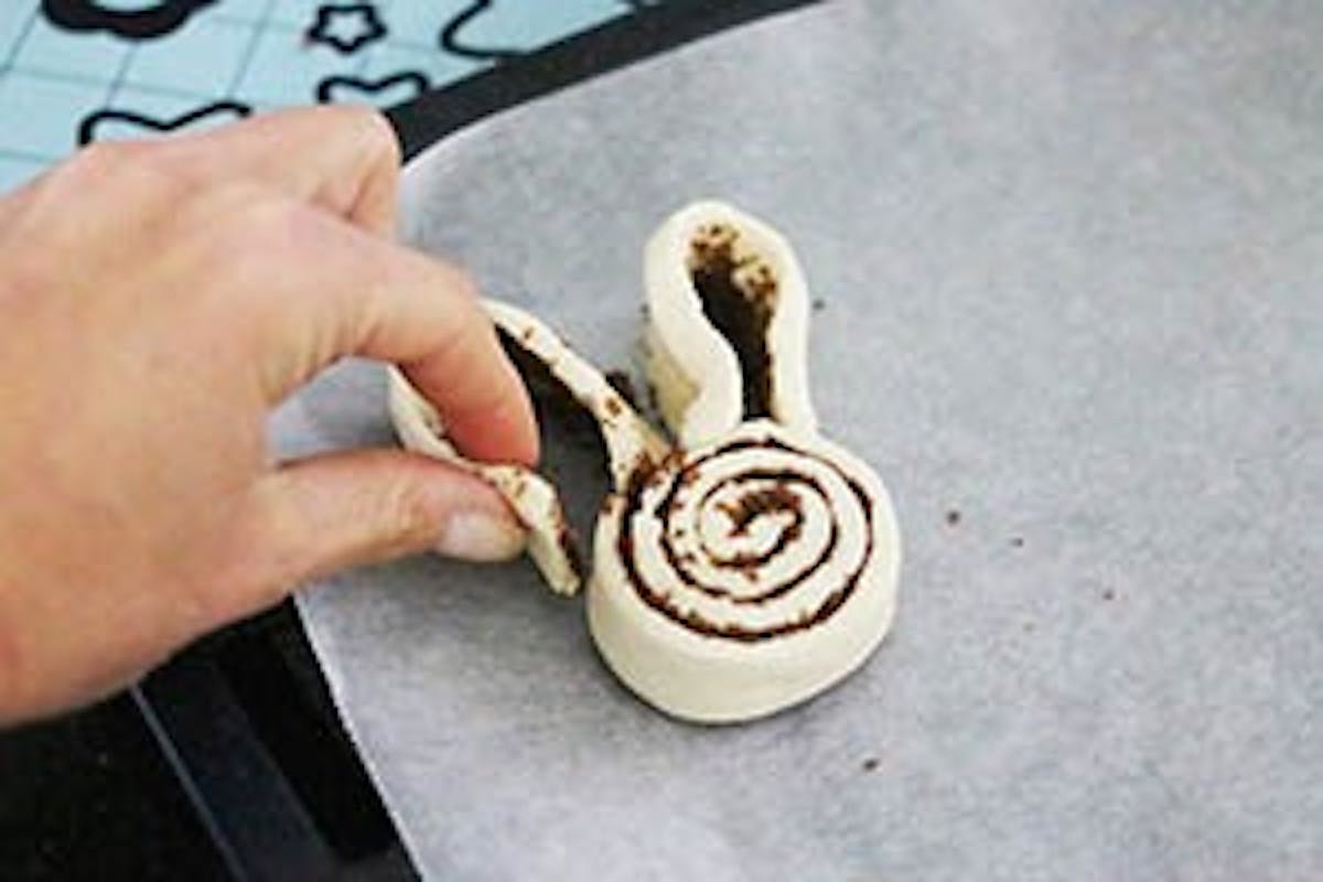 - Halveer het overgebleven stuk reep en maak hier 2 oortjes van door ze te buigen en vast te maken aan het rondje. Doe dit bijvoorbeeld met een vork. Je kunt de oortjes het beste een beetje plat drukken anders bestaat de kans dat ze tijdens het bakken omvallen.