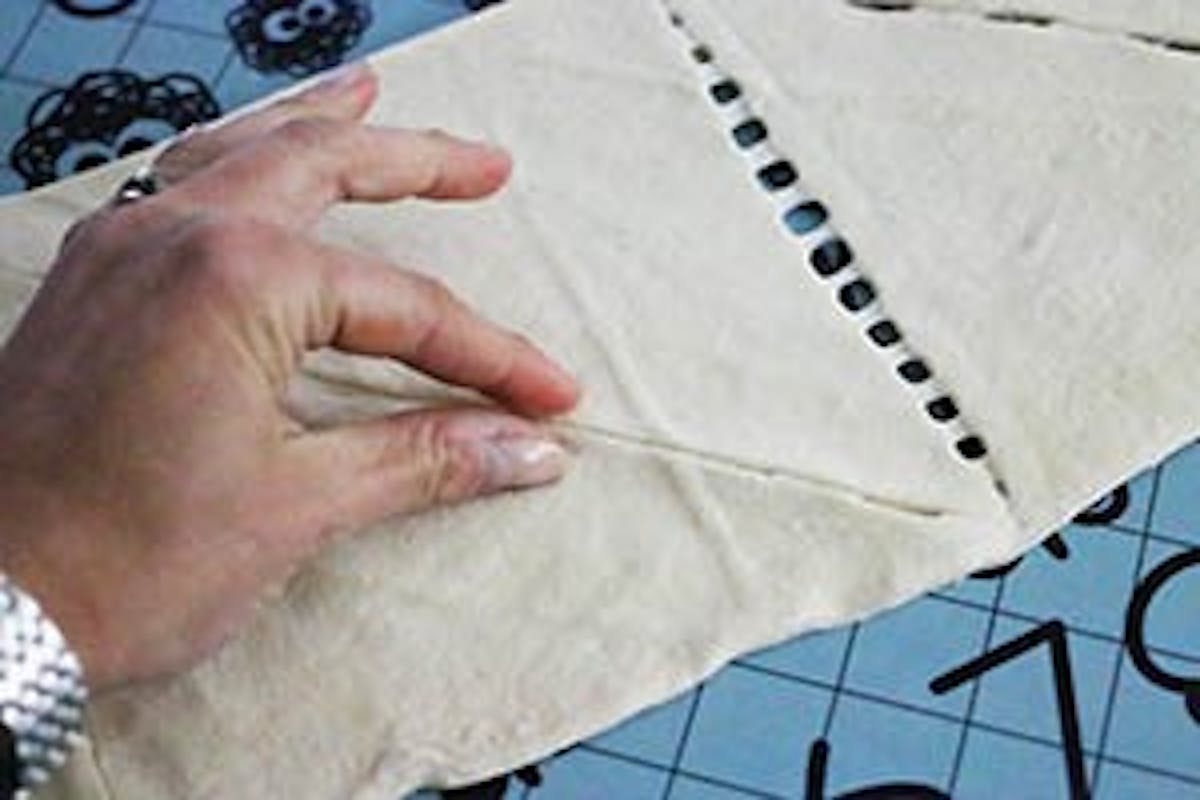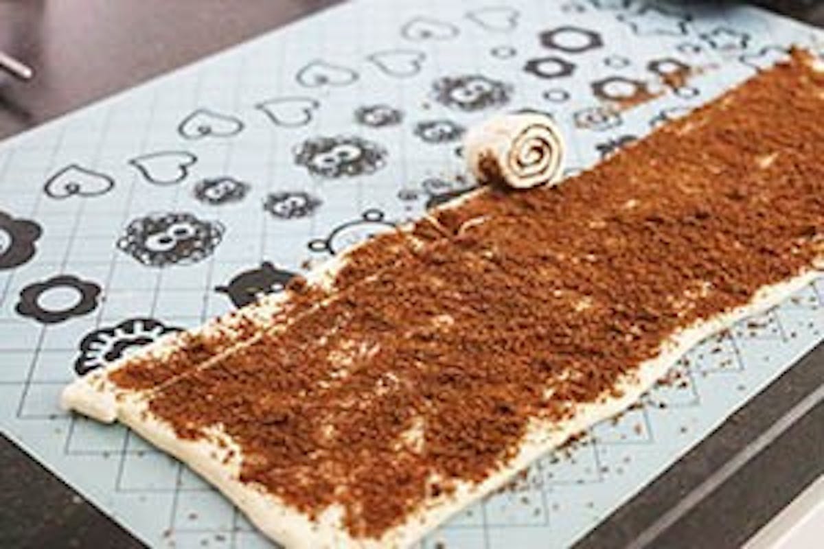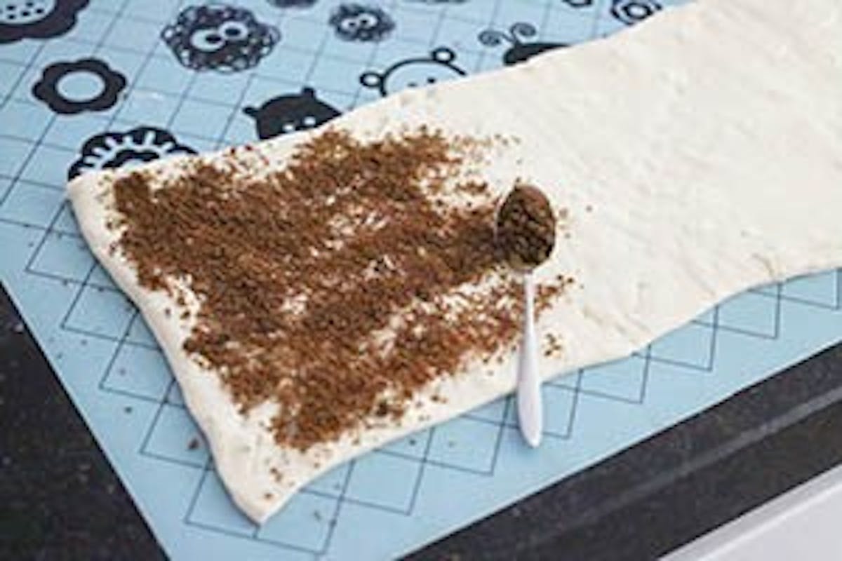 - Verwarm de oven op 200 graden. Meng de suiker met kaneel in een kommetje. Rol het croissantdeeg uit en druk alle naden goed aan elkaar tot 1 grote lap deeg. Besmeer deze met de boter en bestrooi met de kaneelsuiker. Snijd 8 dunne repen van het deeg over de lange zijde. Snijd de repen op ca. ⅔ door en rol het langste stuk op tot een rondje en leg op de bakplaat met bakpapier.