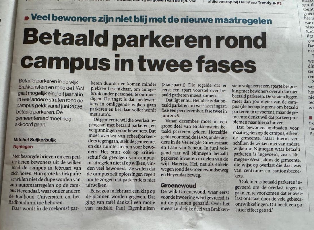 Op 16 april 2025 heeft het College het Raadsvoorstel Betaald Parkeren rond de campus vastgesteld. Het voorstel houdt in dat het betaald parkeren in twee fases wordt ingevoerd waarbij Brakkenstein als eerste gebied aan de beurt is, namelijk eind 2025. De tekst hiervan is te bekijken via deze link: