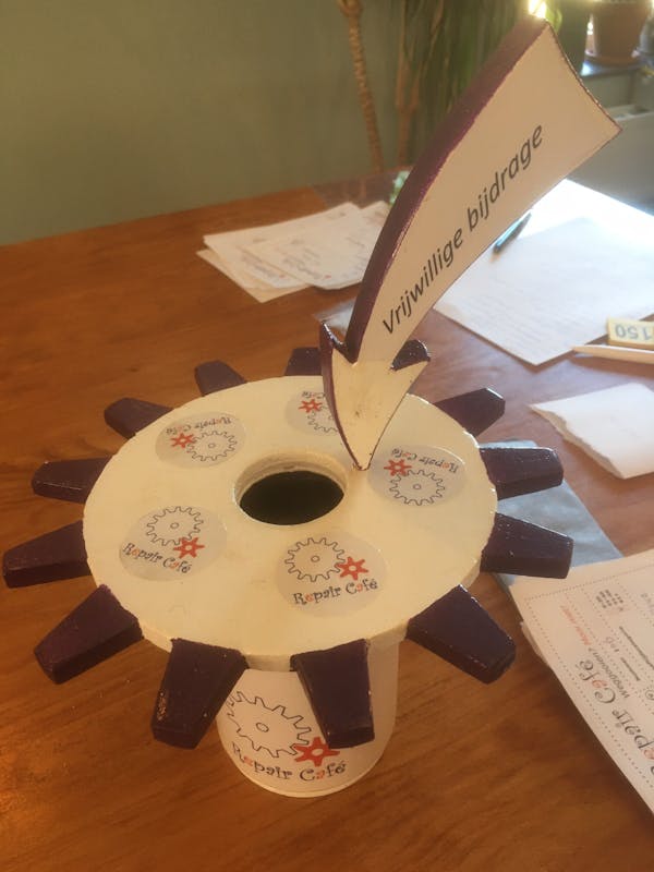 Bernadette staat bij de naaitafel, ze is aan het opruimen, ze heeft onder meer twee broeken ingekort. De reparatiespullen blijven bij BUUR, dat is voor de medewerkers ook fijn natuurlijk. Op iedere tafel staat een doos met een pijl voor een vrijwillige bijdrage. De opbrengst vandaag varieert tussen 20 eurocent en 20 euro. Vaak geven mensen wel zo’n twee euro. Ongeveer 24 mensen hebben vandaag iets laten repareren.